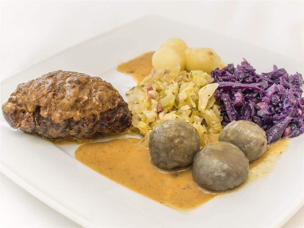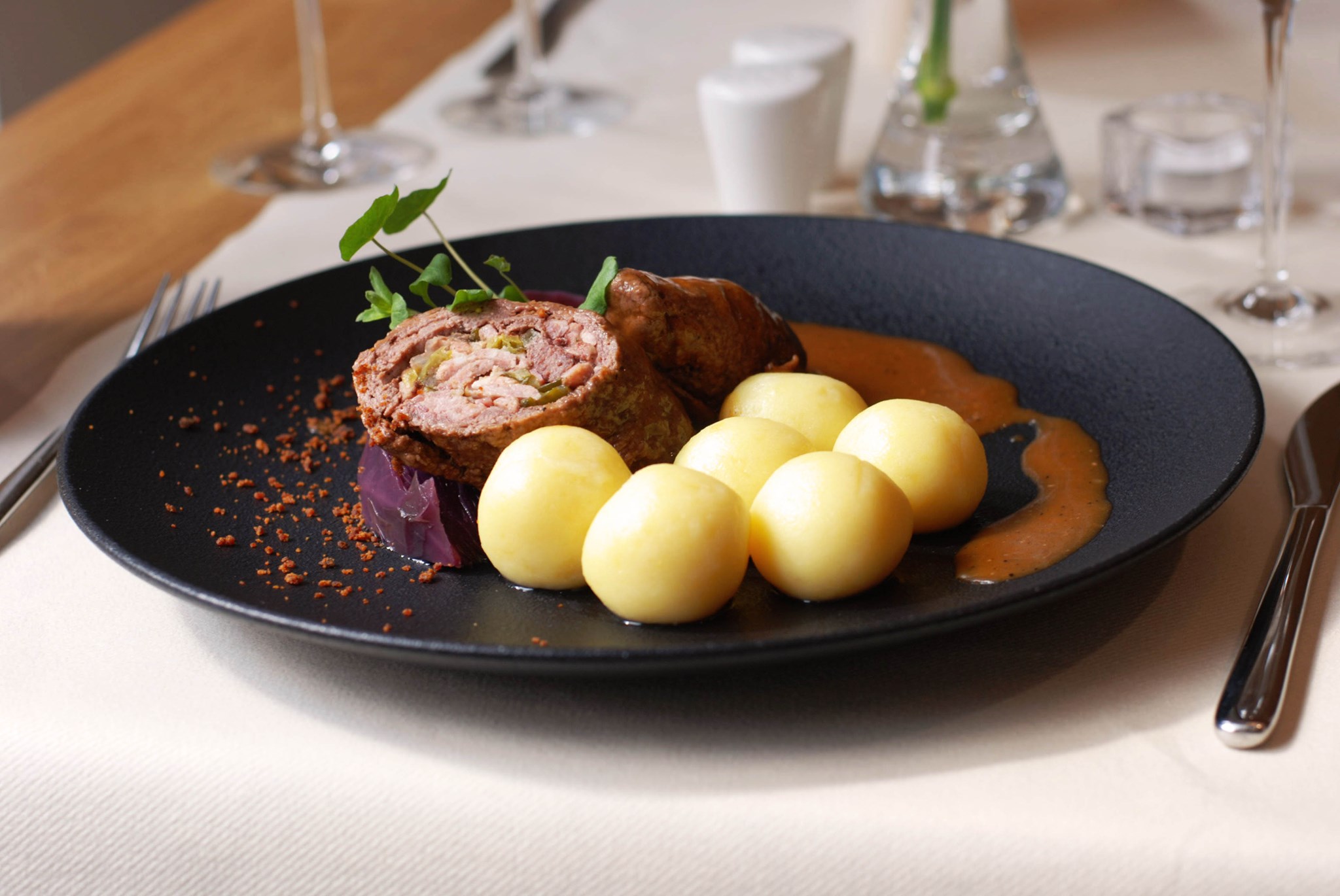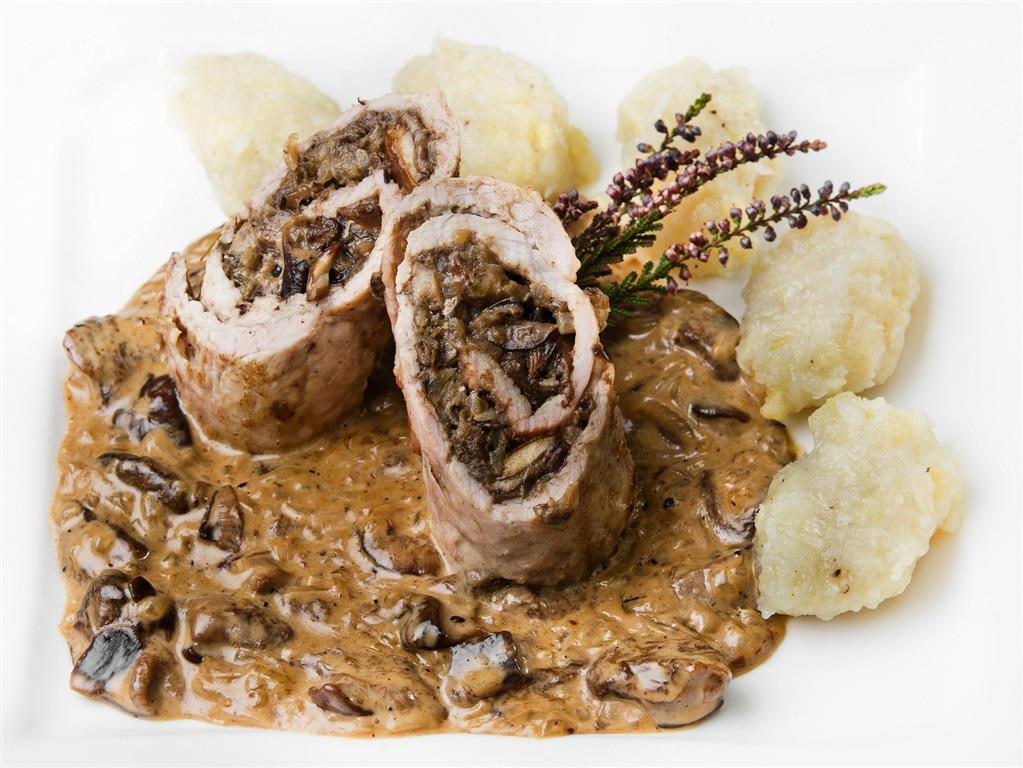 Mięso pokroić w plastry, rozbić, przyprawić solą i pieprzem, posmarować musztardą. Na mięsie rozłożyć równomiernie ogórki pokrojone w paski i boczek wędzony oraz pokrojoną w cząstki cebulę. Plastry mięsa zwinąć, uformować rolady, obwiązać białą nitką, oprószyć mąką i smażyć na rozgrzanym smalcu na patelni ze wszystkich stron. Przełożyć do rondla, podlać tłuszczem ze smażenia i ciepłą wodą, dodać listek laurowy i ziele angielskie, dusić do miękkości. W czasie duszenia rolady obracać i podlewać, a gdy mięso będzie miękkie, wyjąć i sporządzić sos.