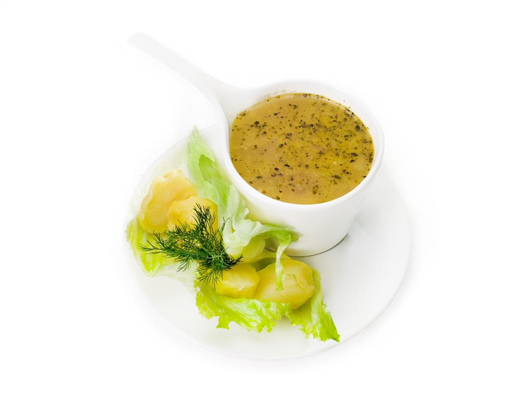 Boczek i kiełbasę przesmażyć, dodać wywar warzywny, śmietanę i chrzan. Zagotować, doprawić solą, pieprzem i magii. Zagęścić zawiesiną z mąki pszennej. Podawać z białą kiełbasą grillowaną, połówką jajka oraz pieczonymi ziemniakami.