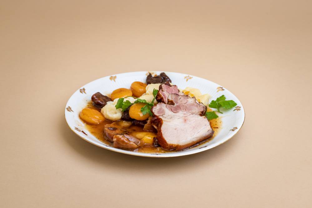 Owoce zalać przegotowaną wodą i zostawić na noc. Do rondla włożyć wędzony boczek, zalać wrzątkiem, gotować go pod przykryciem. Po 50 minutach dodać cynamon, namoczone owoce, sok i otartą skórkę z cytryny, cukier, sól, pieprz i dalej gotować bez przykrycia ok. 30 minut. Mięso wyjąć, ostudzić i pokroić na 10 jednakowych plastrów. Sos odparować, zagęścić rozpuszczoną w zimnej wodzie mąką ziemniaczaną, doprawić, zagotować. Ugotowane owoce ułożyć na talerzach, na nich pokrojony boczek, polać sosem. Potrawa może być podawana również w wariancie z powidłami lub jako mięso wieprzowe bez kości zamiast boczku. W wariancie prezentowanym podawana z gałuszkami (kluseczkami).