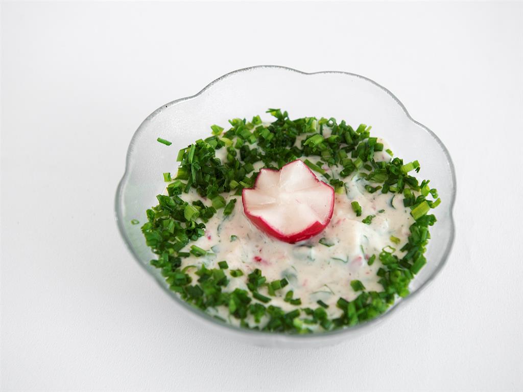 Przygotować sos; śmietanę łączyć z pozostałymi składnikami, doprawić do smaku. Filety podzielić na porcje, ułożyć na półmisku, zalać sosem. Brzegi półmiska obsypać szczypiorkiem, całość przybrać natką i ,,różyczkami” z rzodkiewek.