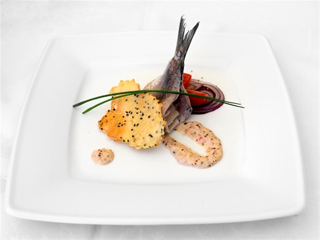 Matiasa wymoczyć w maślance i drobno pokrojonej cebuli. Ziemniaki ugotować (rozgotować), zblendować, zmieszać z czarnuszką. Rozsmarować cieniutko na pergaminie. Piec w temperaturze 100˚C. Do momentu wysuszenia. Szalotkę obrać. Pokroić , podsmażyć na maśle, dodać białe wino i odparować alkohol. Dodać musztardę, zamieszać. Przyprawić maślankę i pieprzem białym. Zmiksować. Śledzie podajemy z sosem musztardowym chipsem ziemniaczanym, polewamy oliwą.