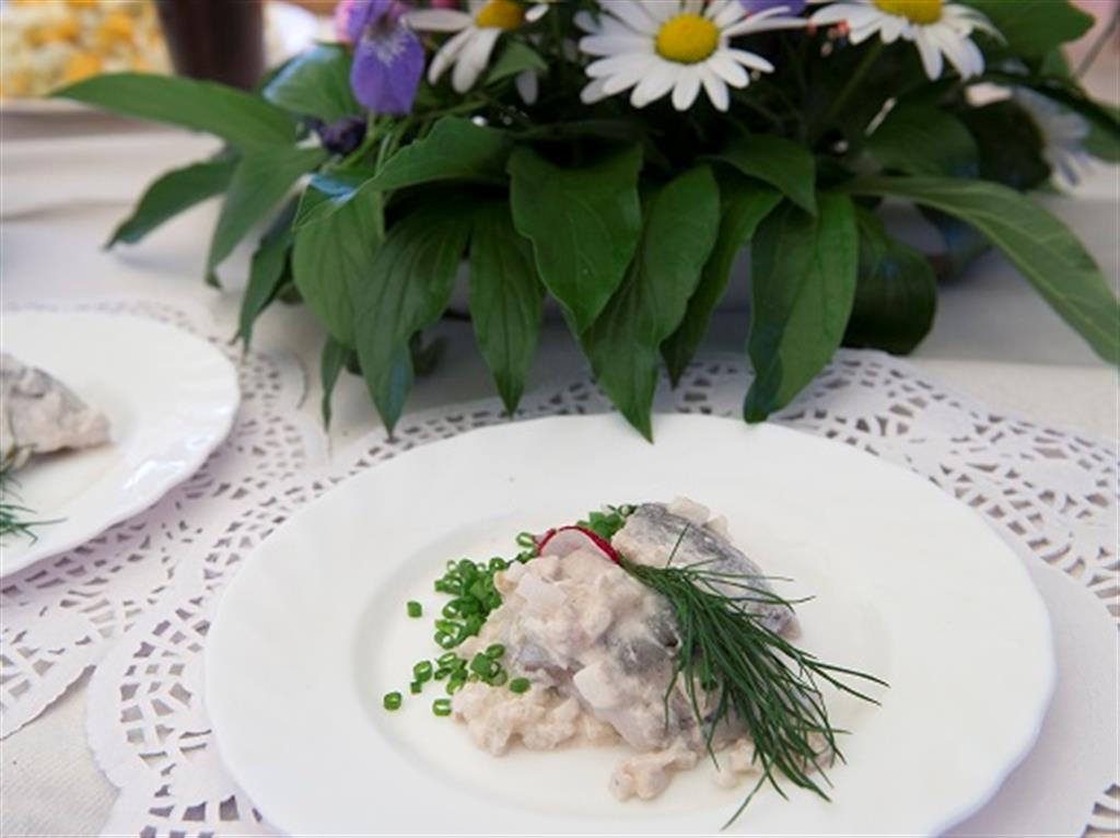 Śledzie wymoczyć przez kilka godzin w zimnej wodzie zmienianej 2-3 razy. Wymoczone śledzie wyfiletować i obrać ze skóry a także usunąć duże ości. Cebulę obrać, pokroić w drobną kostkę, sparzyć wrzątkiem. Jabłka poszatkować, dodać je do śmietany razem z cebulą i cukrem. Filety śledziowe ułożyć na półmisku, mlecz przetrzeć przez sito i połączyć ze śmietaną. Następnie wymieszać i zalać śledzie. Podawać z pieczywem.