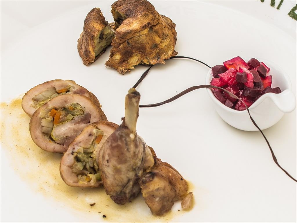 Tuszkę z królika wytrybować, zostawiając comber razem ze skórą z mostka. Przyprawić solą, pieprzem. Nadziać jarzynką z pokrzywy (umytą pokrzywę wrzucić na 2-3 minuty na lekko osolony wrzątek, odcedzić, przelać zimną wodą, osączyć, drobno usiekać, wymieszać z orzechami i zieleniną. W rondlu stopić masło, zeszklić na nim drobno pokrojoną cebulę, dodać pokrzywę i drobniutko usiekany czosnek, sól, pieprz, skropić sokiem z cytryny i chwilę dusić na niewielkim ogniu, dokładnie wymieszać) doprawić chrzanem, na wierzch ułożyć marchew. Zwinąć roladę, owinąć mocno folią. Piec w piekarniku. Przed podaniem obsmażyć na złoty kolor na smalcu.