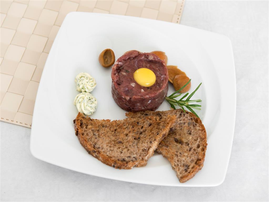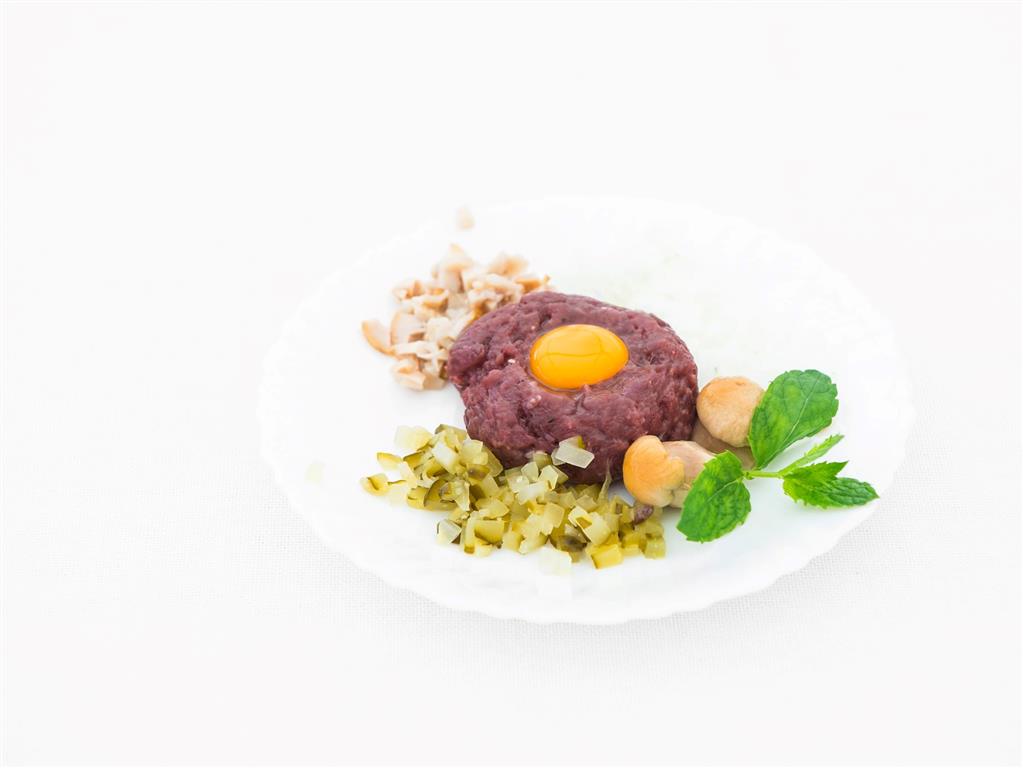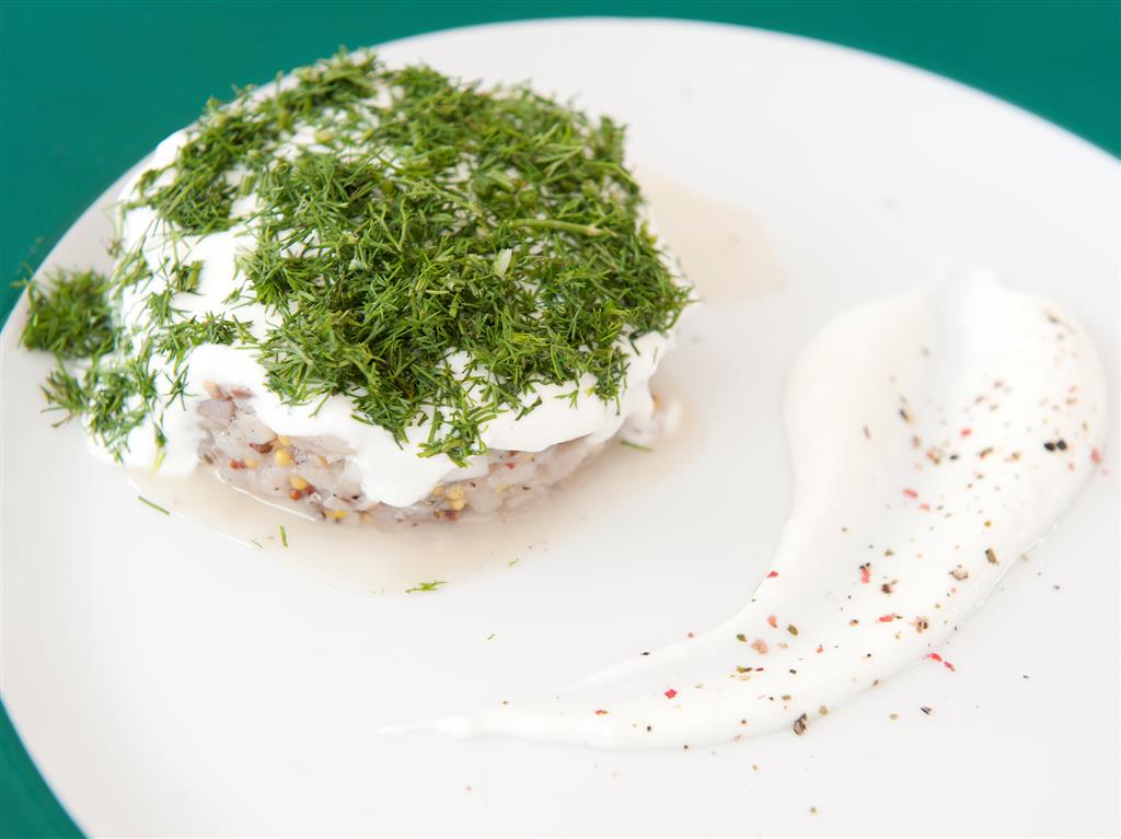 Filety namoczyć na 1-1,5 godz. w zimnym mleku , odcedzić. Śledzie obłożyć plastrami jednej sparzonej cebuli, liśćmi laurowymi i zielem angielskim, skropić sokiem z cytryny, zielonym pieprzem w zalewie, zalać olejem. Marynować co najmniej 6 godz. Filety osuszyć z marynaty, pokroić w drobną kostkę, wymieszać z drobno posiekaną pozostałą cebulą i koperkiem. Doprawić solą, pieprzem, sokiem z cytryny oraz musztardą. Ułożyć na talerzach porcje tatara, przykryć je półcentymetrową warstwą śmietany i udekorować koperkiem oraz cytryną.