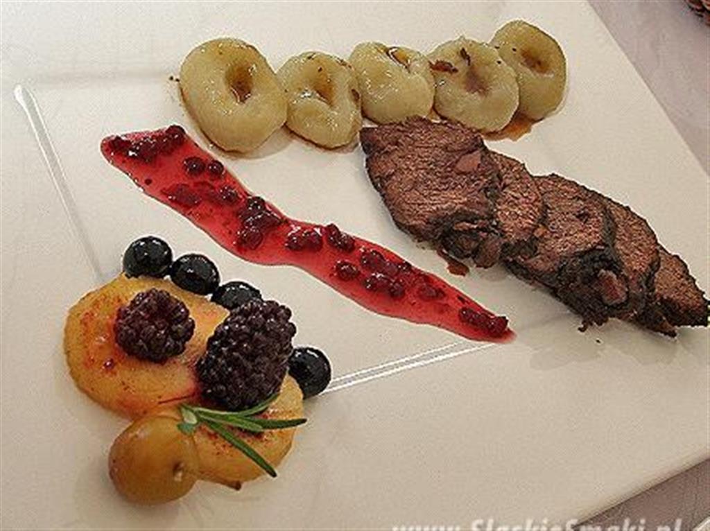 Comber marynujemy przez 12 godzin (inna część sarniny przez 1-2 dni). Szpikujemy boczkiem, przyprawiamy ziołami i smażymy na sklarowanym maśle z każdej strony, podlewamy czerwonym winem i krótko dusimy. Czarne kluski przygotowujemy z gotowanych ziemniaków i kilku startych surowych ziemniaków z dodatkiem mąki ziemniaczanej (1/4 objętości ziemniaków) i jaja. Formujemy kluski z dziurką i gotujemy w dużej ilości osolonej wrzącej wody.