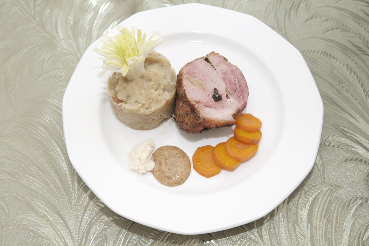 Podajemy w talerzu z chrzanem i musztardą, ciaper kapustą wyporcjowaną łyżką lub od foremki, dekorujemy pióropuszem z pora. Możemy podać z surówkami i piwem jasnym.