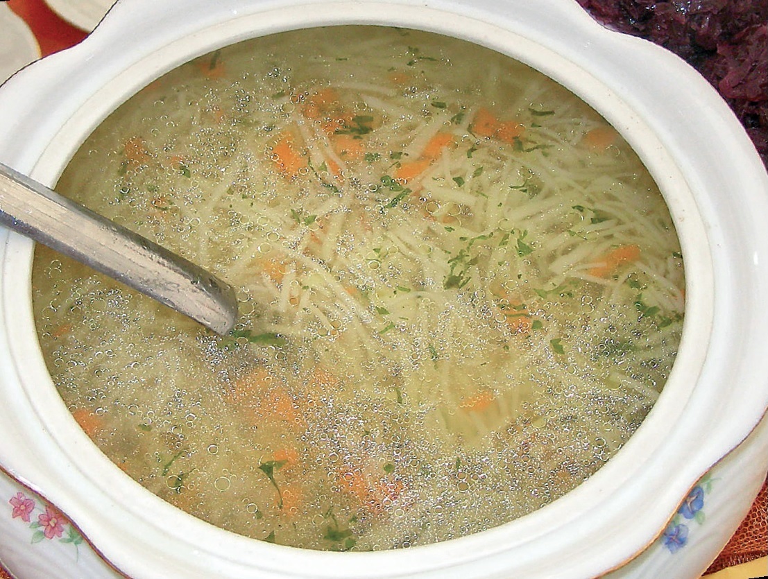 Kurę i warzywa gotujemy do miękkości przez ok. godzinę, solimy i pieprzymy. Gotowy wywar przecedzamy i ponownie gotujemy, dodając łyżeczkę przyprawy do zup i pokrojone w drobną kosteczkę ugotowane warzywa. Do gotującego się rosołu wsypujemy makaron. Gdy wywar się zagotuje, odstawiamy go na 15 min, do zmięknięcia makaronu.