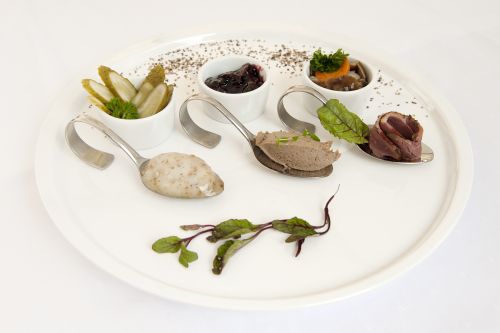Smalczyk z gęsi z jabłkiem i cebulką w towarzystwie ogórka małosolnego, pasztet z gęsi z confie gruszkowo – wiśniowo – śliwkowym, wędzona w dymie olchowym pierś z gęsi z marynowaną opieńką