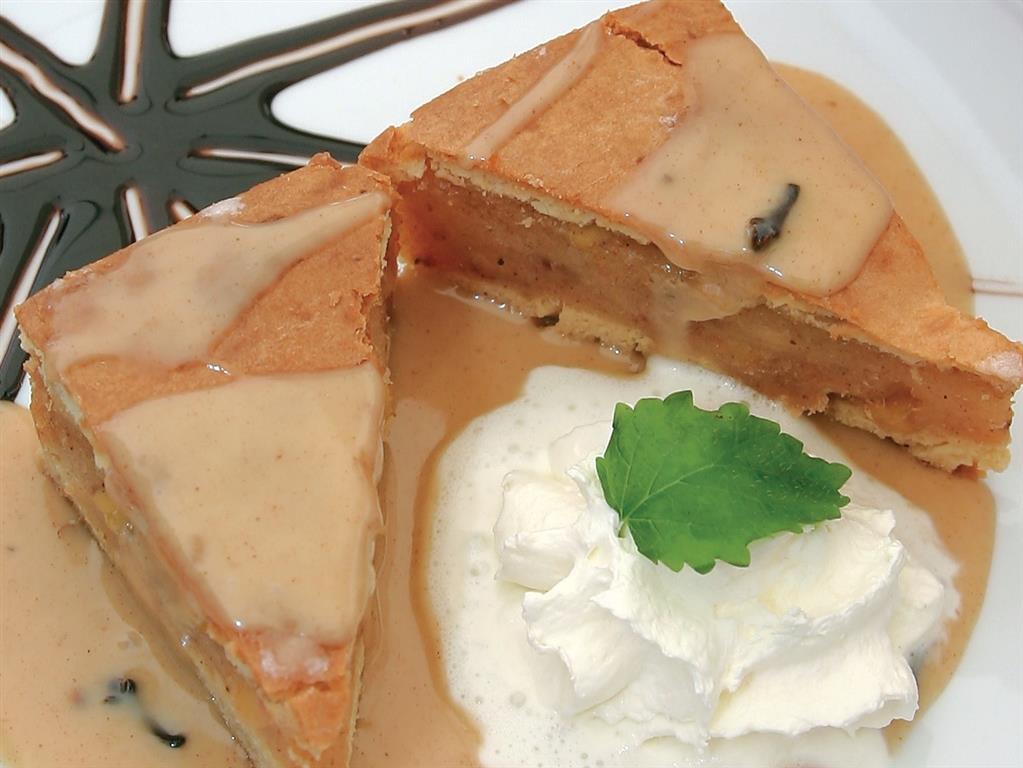 Jabłecznik z bakaliami. Przepis pochodzi z lat 50-tych od babci Bronki, babci Szefa kuchni. Przepis był przekazywany z pokolenia na pokolenie, dzięki temu ciasto smakuje tak samo jak u babci.