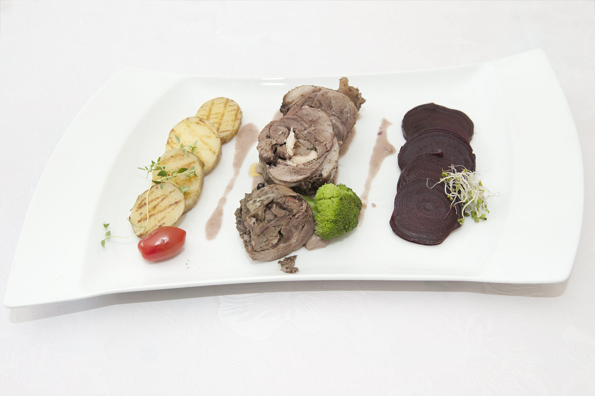 Udko gęsie faszerowane wątróbką i kurczęciem podane na kremowym sosie borowikowo-jeżynowym w kompozycji glazurowanych buraczków i pieczonych ziemniaków