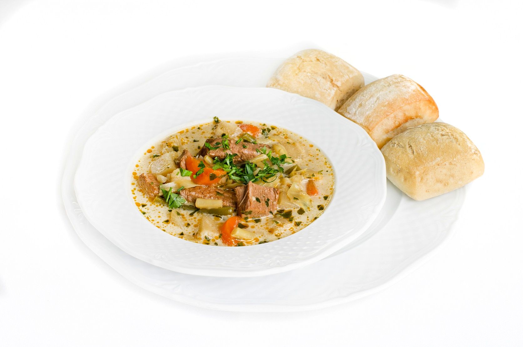 Ziemniaki i warzywa umyć i rozdrobnić (ziemniaki, marchew, seler, pietruszkę, kalarepę, kapustę), por pokroić w plasterki, fasolkę w ukośne kawałki, kalafior podzielić na różyczki, posiekać zieleninę. Warzywa ugotować we wrzącej solonej wodzie, przy czym kalafior dodać nieco później. Mięso gulaszowe poddusić, a następnie dodać do zupy. Na koniec dodać zahartowaną śmietanę oraz posiekaną zieleninę.