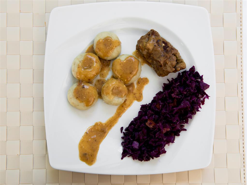 Traditional Silesian dinner served on Sundays: Beef roulade, Silesian dumplings and red cabbage. The roulade is filled with bacon, sour cucumbers, onion and mustard. It is very popular dish in the central part of the region.