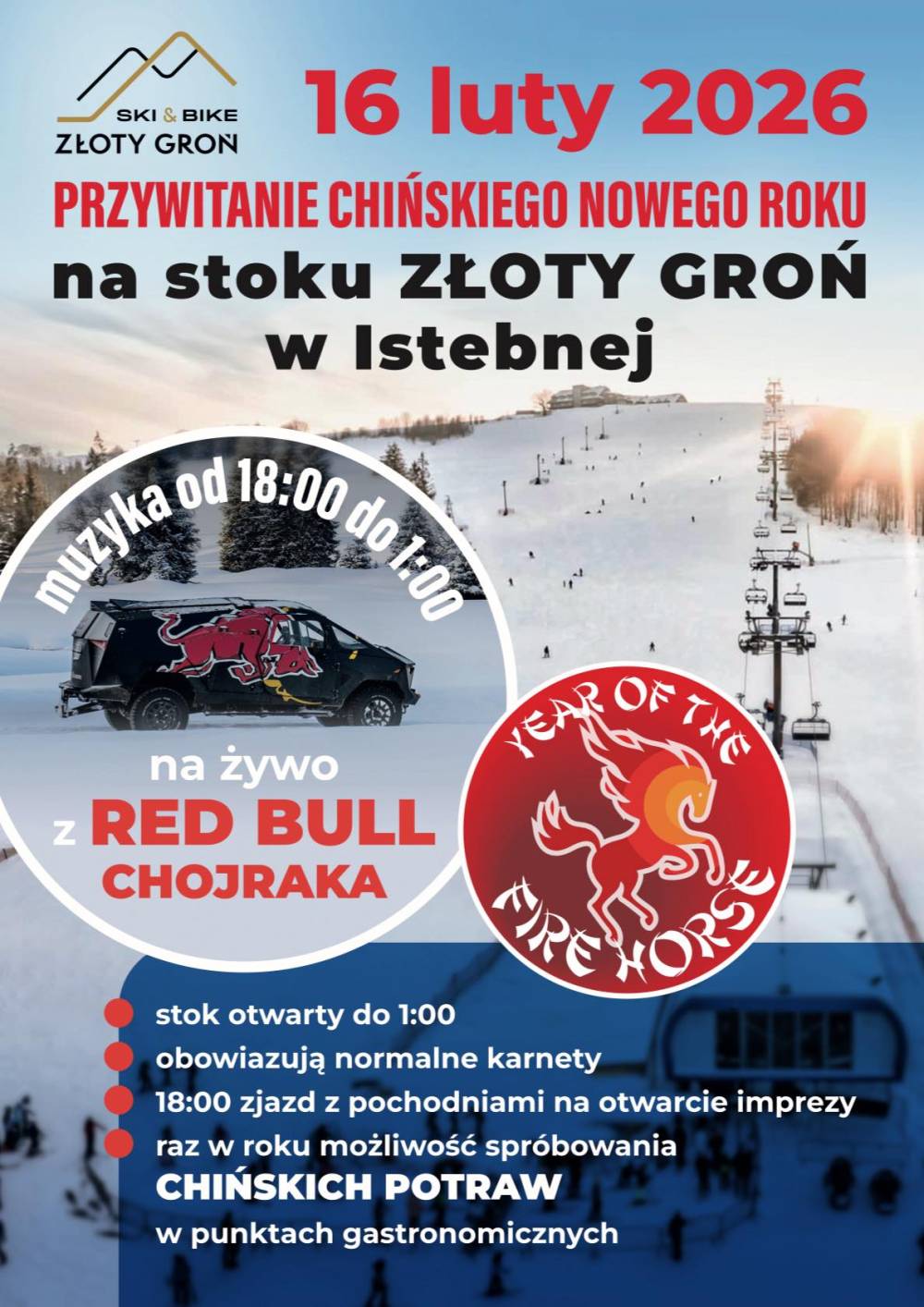 Złoty Groń Ski & Bike Resort zaprasza na Przywitanie Chińskiego Nowego Roku na Stoku Złotego Gronia w poniedziałek 16 lutego o godz. 18.00