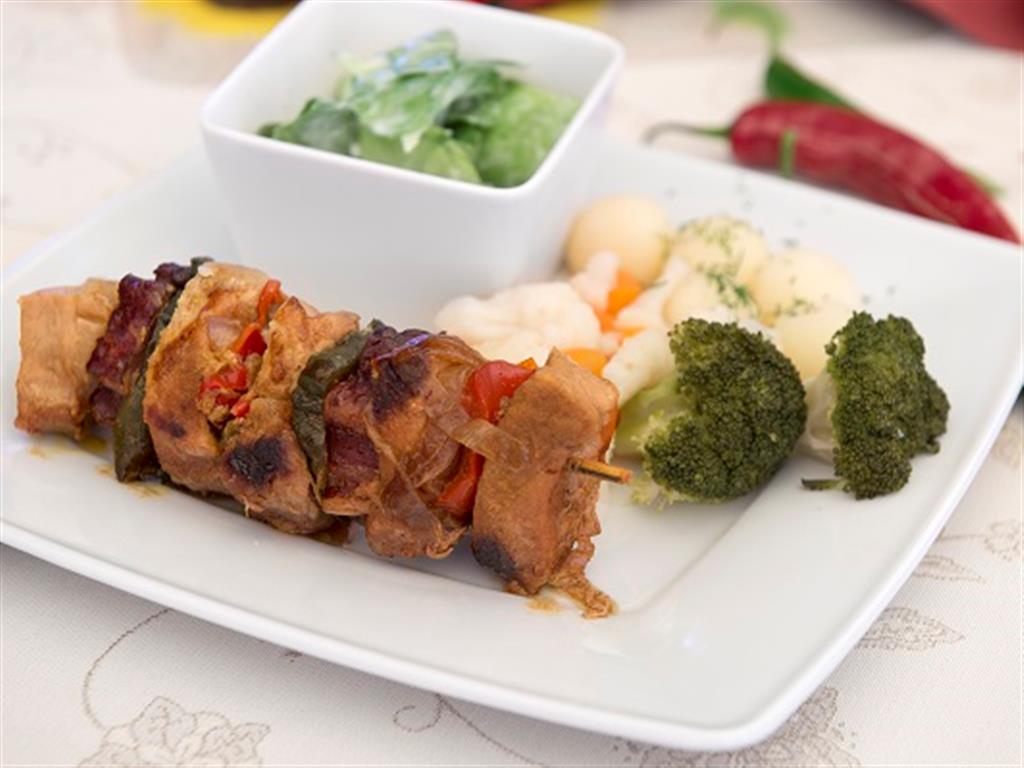 Mięso pokroić na średniej wielkości kostki, boczek w plastry, ogórek, cebulę w plastry, paprykę w kostkę. Na przemian nabijać na szpilkę drewnianą. Wszystko smażymy na margarynie ok. 60 min. Przyprawić wszystko (curry, papryka słodka i ostra mielona, pieprzem, solą, maggi) pod koniec smażenia dodajemy ketchup rozcieńczony wodą. Ziemniaki młode ugotować do miękkości, następnie podsmażyć na maśle. Jarzynę ugotować na parze.