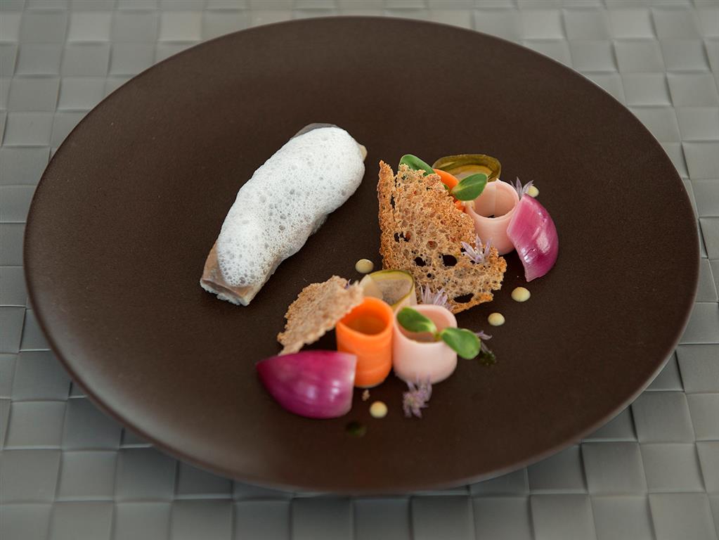 Na początku zrobić obróbkę wstępną wątróbki, następnie obsmażyć ją na maśle klarowanym, dołożyć czosnek, podlać czerwonym winem a następnie kremem balsamicznym i zredukować, krupniok pokroić na grube plastry (beczki);