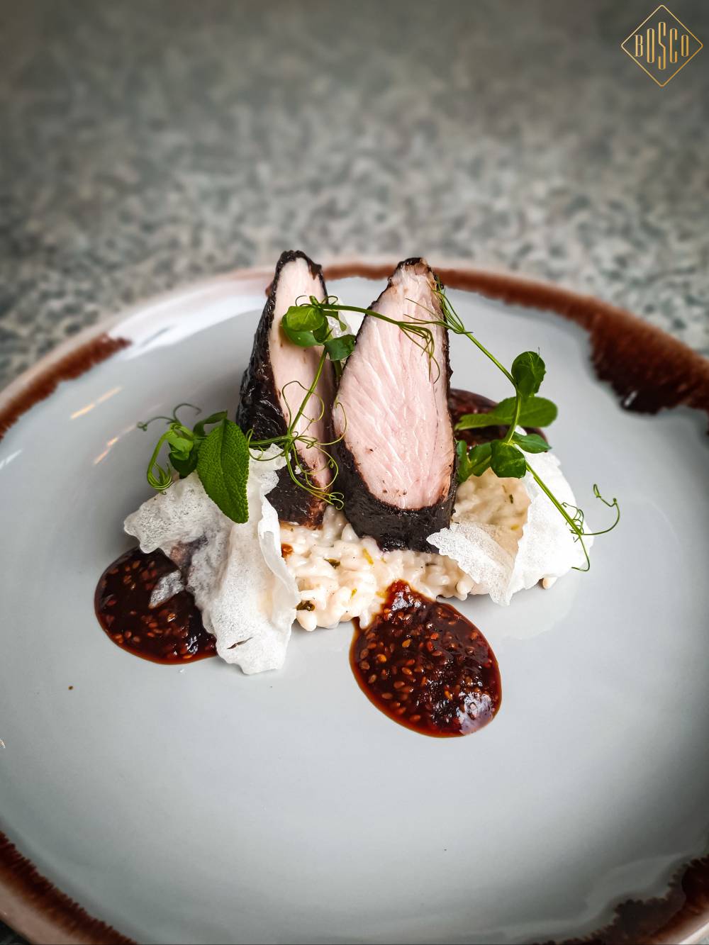 #Restauracja Bosco - indyk w algach nori z risotto, chmurką ryżową i sosem sezamowym [Silesia]