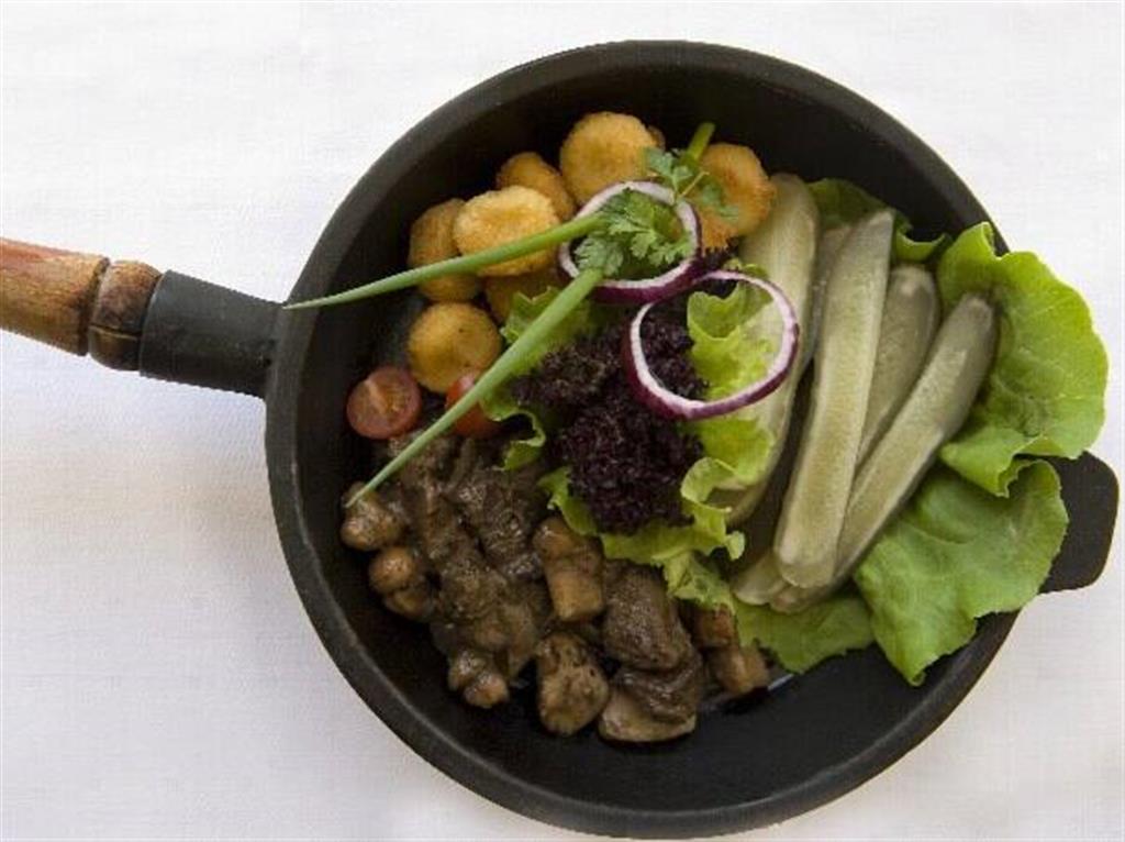 Brązowa skórka, w środku konsystencja klopsa z widoczną polędwiczką koloru jasnobrązowego.