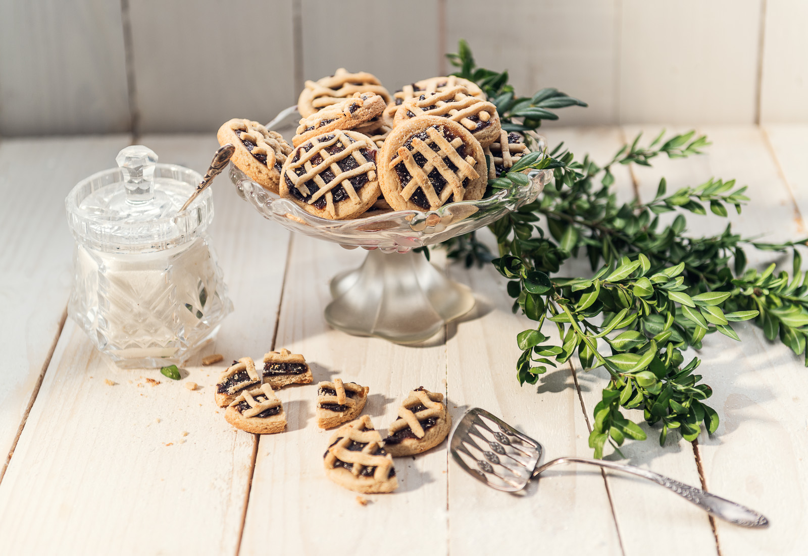 Ciastka posmarowane marmoladą, na powierzchni ozdobna kratka z ciasta.