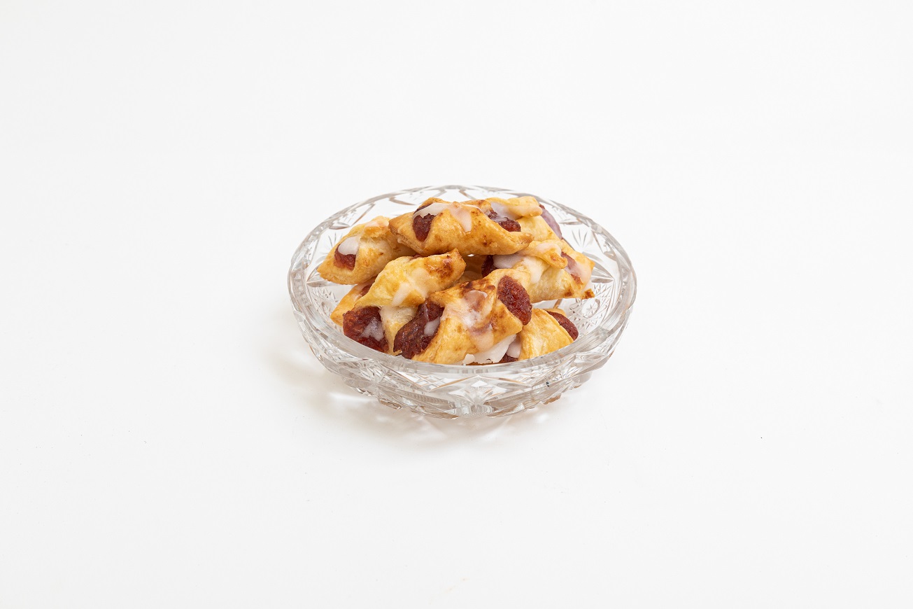 Ciastka z nadzieniem z marmolady, sera lub maku, posypane cukrem pudrem lub polukrowane. Struktura wewnętrzna wyraźnie listkowana, popękana.