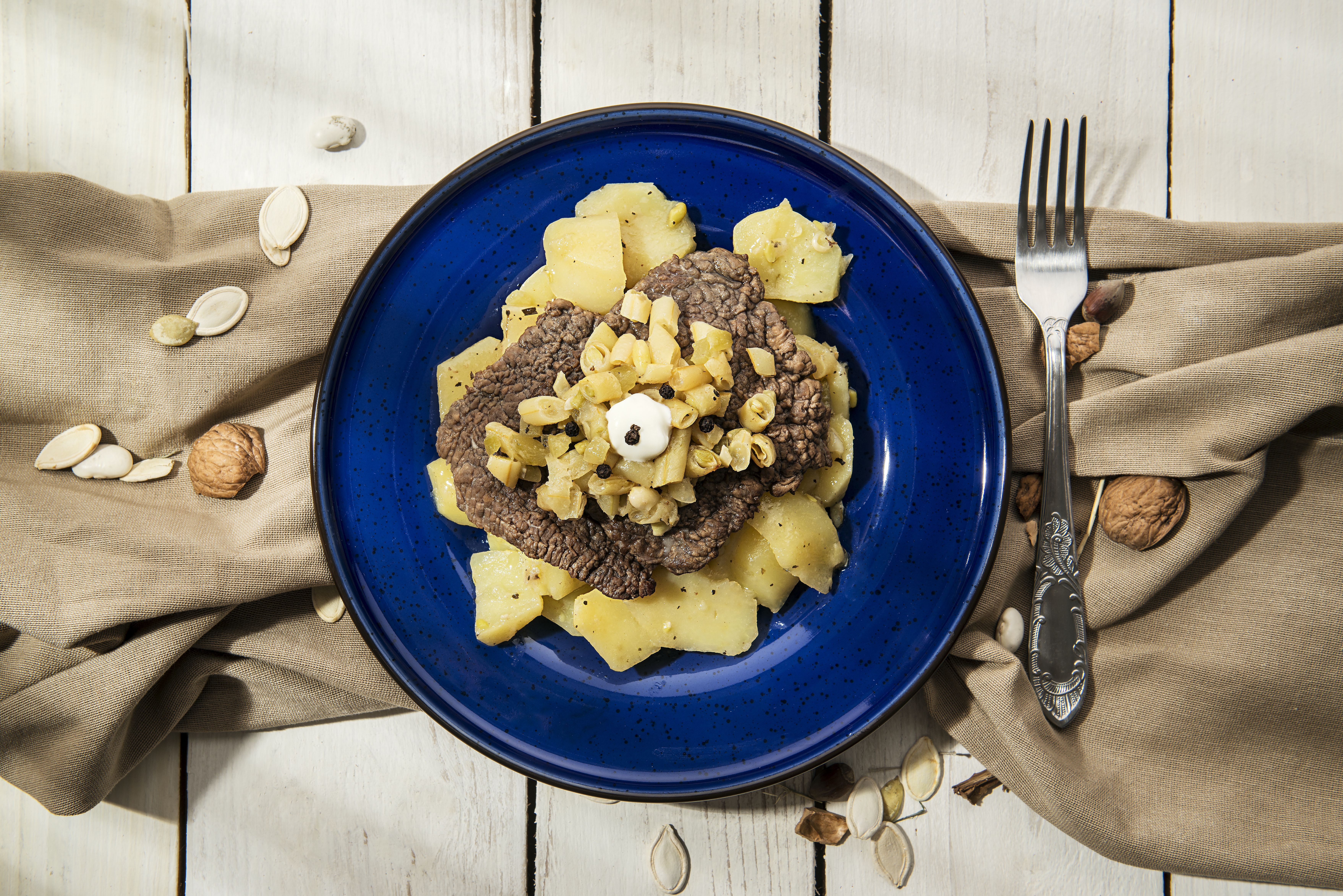 Wierzchnią warstwę potrawy stanowią kawałki pokrojonej fasolki szparagowej i plasterki ogórka kiszonego. Na przekroju widać na samym spodzie grube plastry ziemniaka, na nich dwa plastry mięsa i mieszaninę fasolki szparagowej i ogórka kiszonego. Ziemniaki, mięso i częściowo mieszanina fasolki i ogórka zatopione są w sosie.