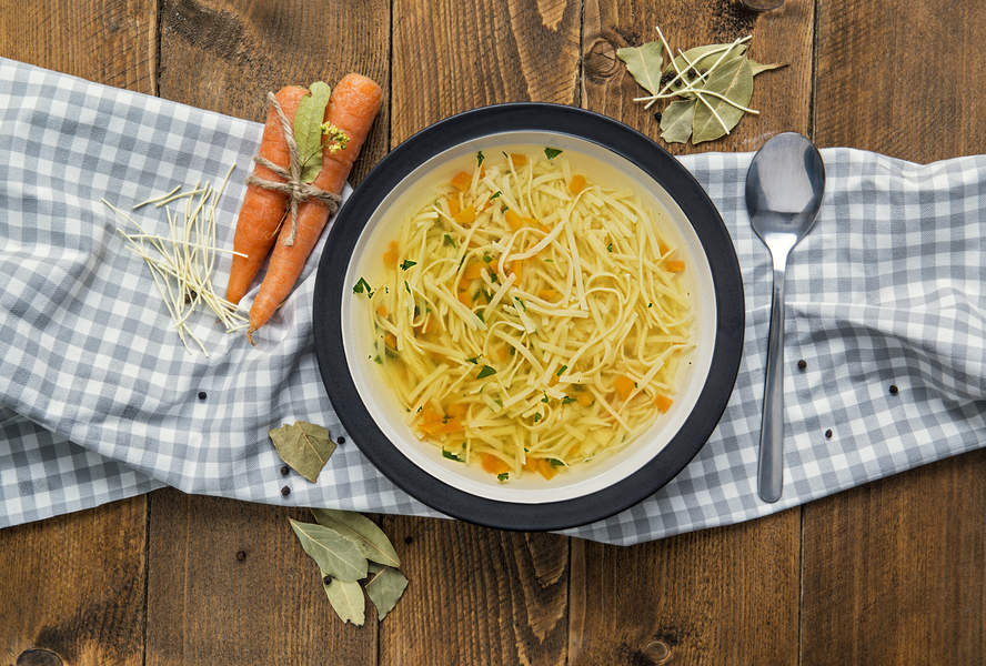 Klarowny płyn z widocznymi, błyszczącymi oczkami tłuszczu na powierzchni i zanurzonym makaronem. Dodatkami są marchewka i drobno posiekana pietruszka.