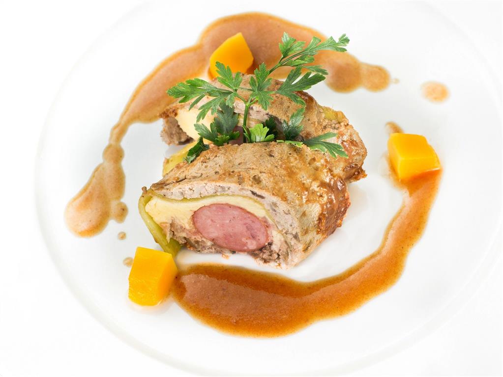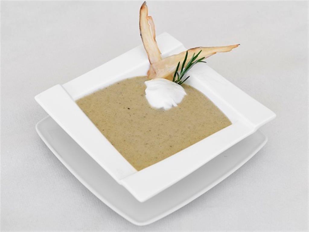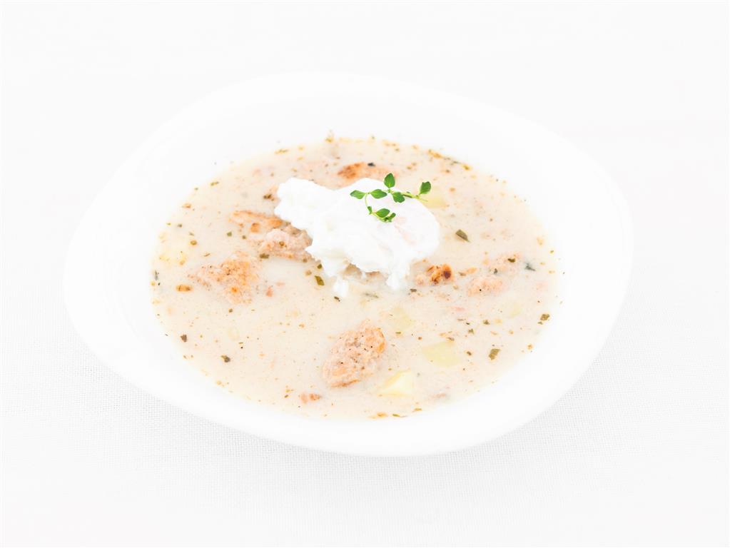 Kolor żółty, z jasno brązową wędzonką i świeżym zielonym szczypiorkiem.