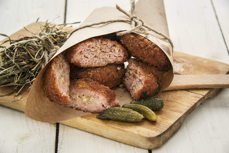 Z zewnątrz wygląd smażonego panierowanego mięsa wieprzowego, na przekroju wygląd mięsa mielonego