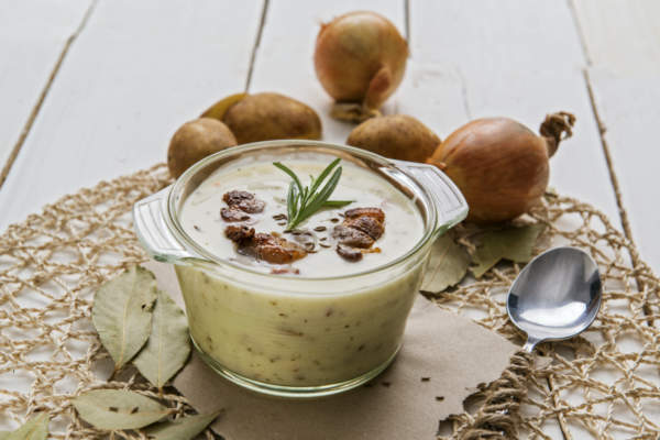 Zupa jasnej barwy z widocznymi skwarkami, przesmażoną cebulą i ziemniakami
