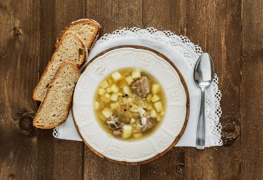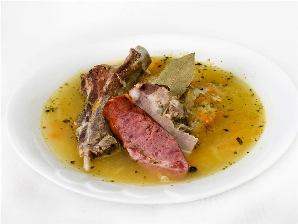 Klarowny wywar z kiszonej kapusty i mięsa wieprzowego. Z gotowanymi kawałkami mięsa wieprzowego, ziemniaków, kapusty kiszonej, marchewki.
