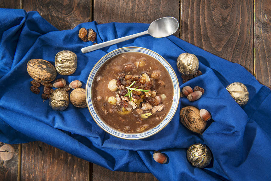 Potrawa gęsta zawierająca kawałki orzechów, migdałów, ugotowanych owoców oraz bakalii. Po umieszczeniu w naczyniu (salaterka porcelanowa lub szklana) przybiera jego kształt, wierzchnia warstwa pozostaje nieregularna.