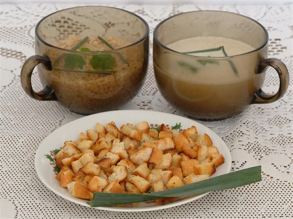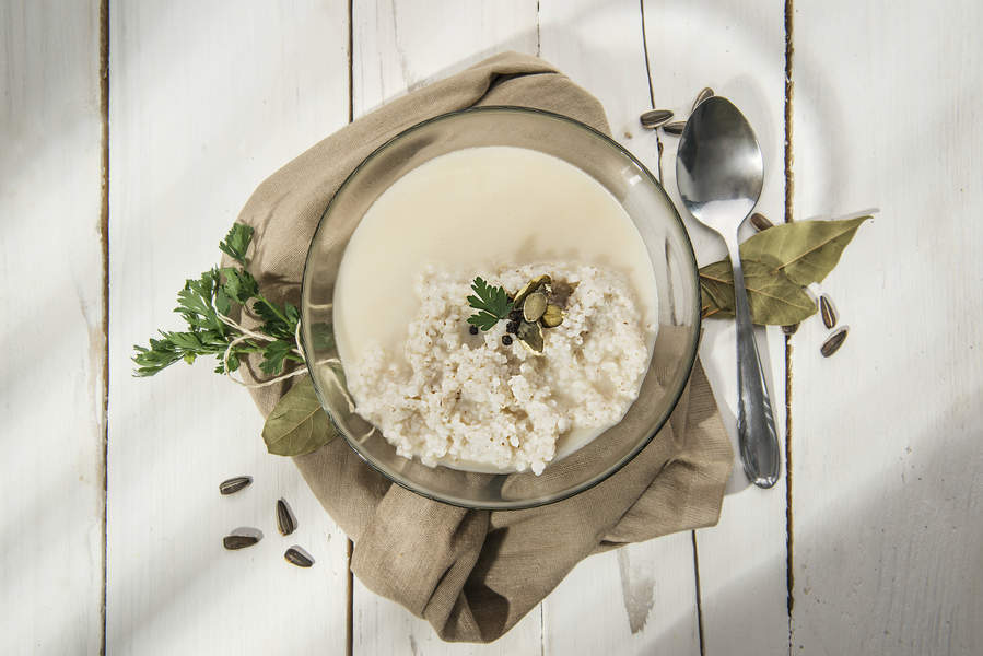 Zupa jasnozielonkawobeżowa z siemienia konopnego z kaszą jęczmienną.