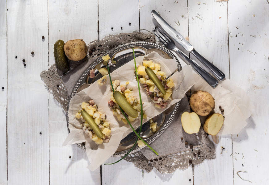 Mieszanka ugotowanego ziemniaka, kiszonego ogórka, cebuli i śledzia.