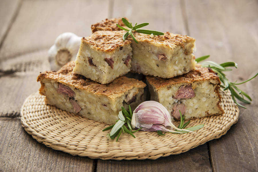 Placek z ciasta ziemniaczanego z widocznymi na przekroju ziarnkami ryżu.