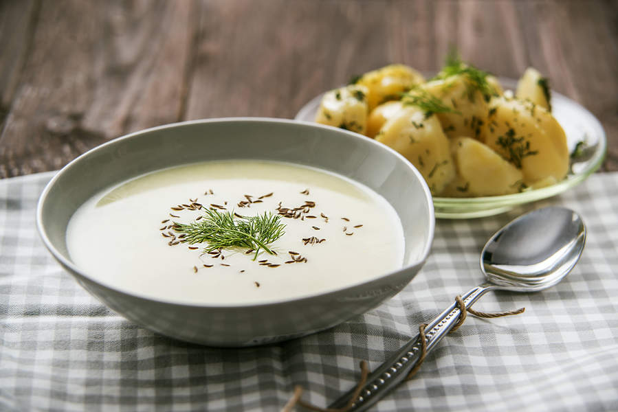 Kremowa dość gęsta zupa z widocznymi kawałkami boczku, ziemniaków i zielonego kopru.