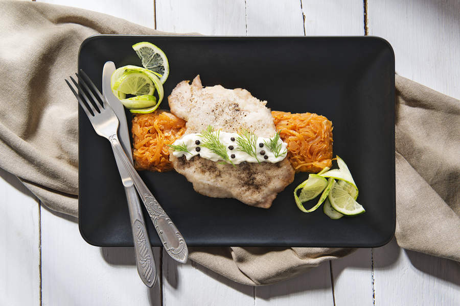 Porcja usmażonej kapusty przykrywająca owalny kawałek usmażonego kotleta.